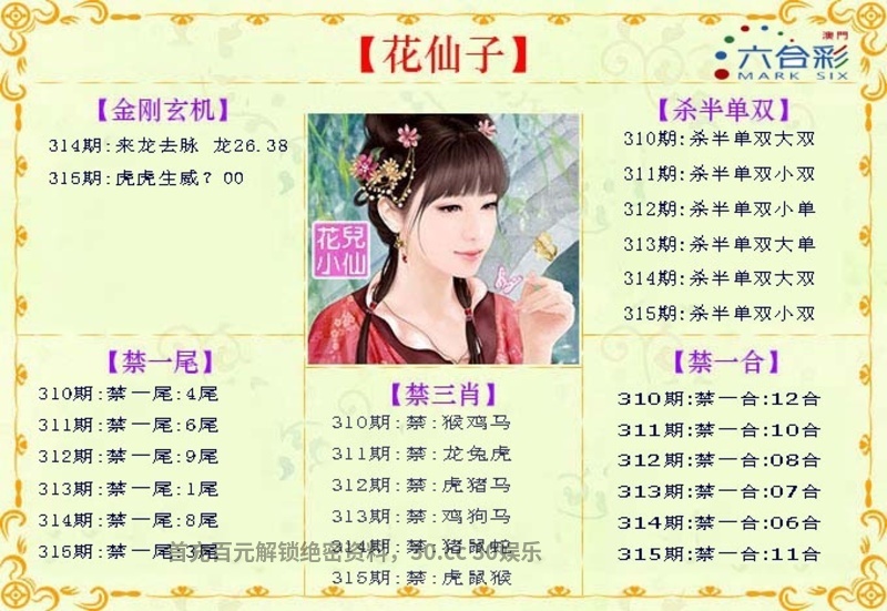 【花仙子解传真】315期:今期生肖一八开,穿金戴银戴兰花。今期特尾二三七,三八三九还要防。风流才子俏佳人,玄机道破点三二。买了一六出二九,森林之中它为王
